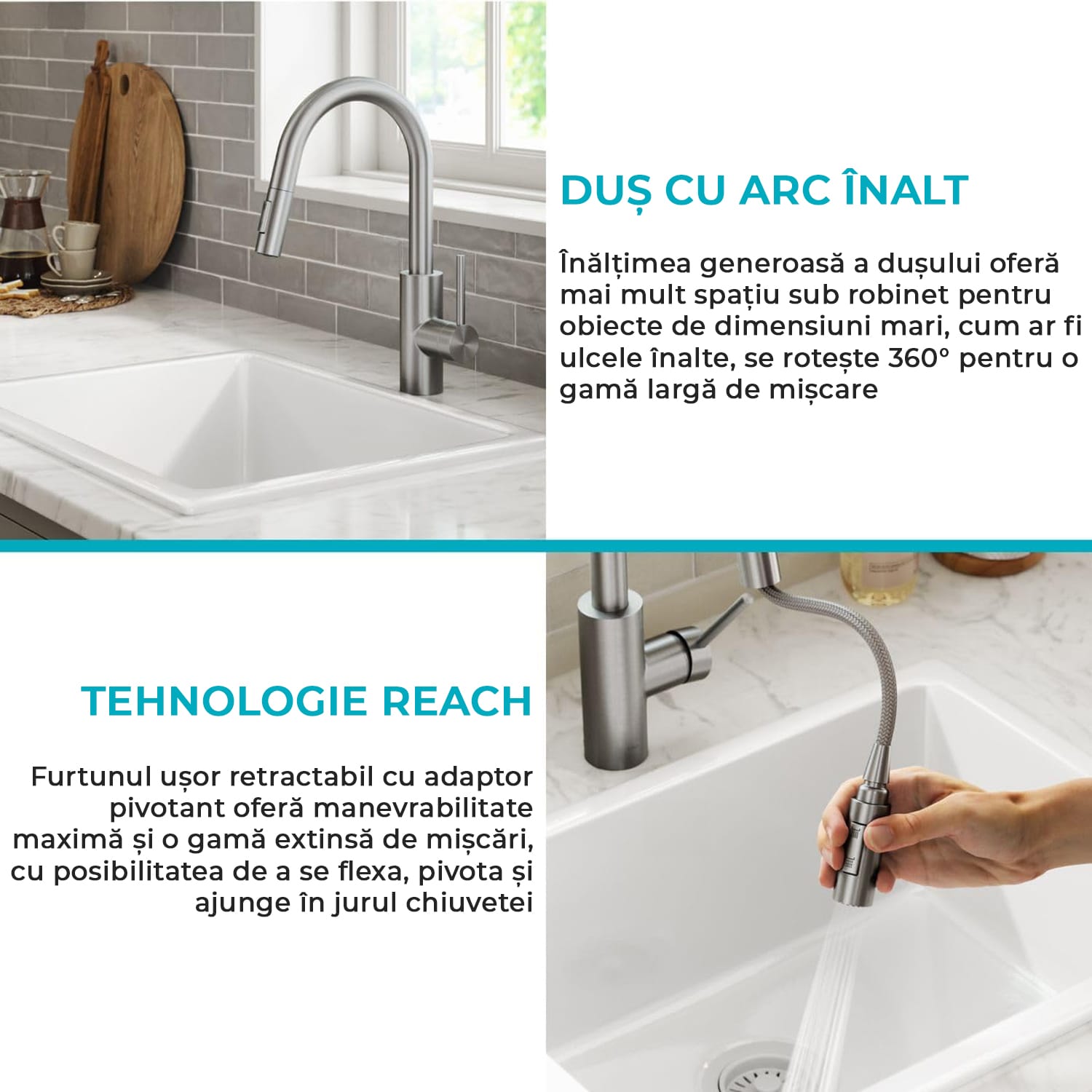 Design Modern: Un robinet impresionant cu un design rationalizat, care se potriveste perfect oricarei chiuvetede bucatarie.