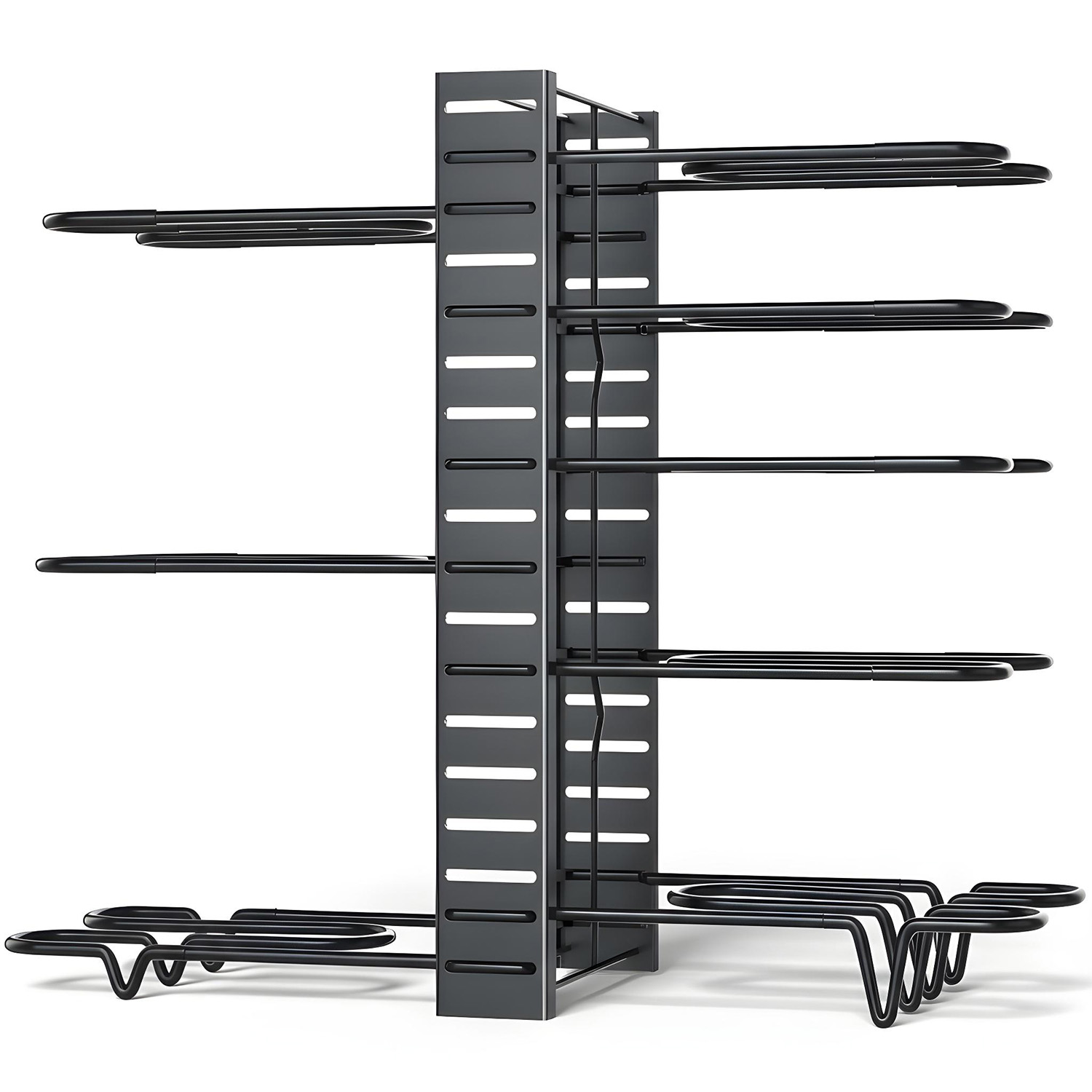 Organizator Vase si Tigai Elindor®, cu 8 niveluri reglabile si 3 moduri de montaj, din otel carbon rezistent, dimensiuni 42 × 20 × 54,5 cm. Ofera stabilitate, montaj fara unelte si protectie anti-alunecare, ideal pentru dulapuri de bucatarie. Pastreaza vasele, tigaiile si capacele ordonate si usor accesibile.