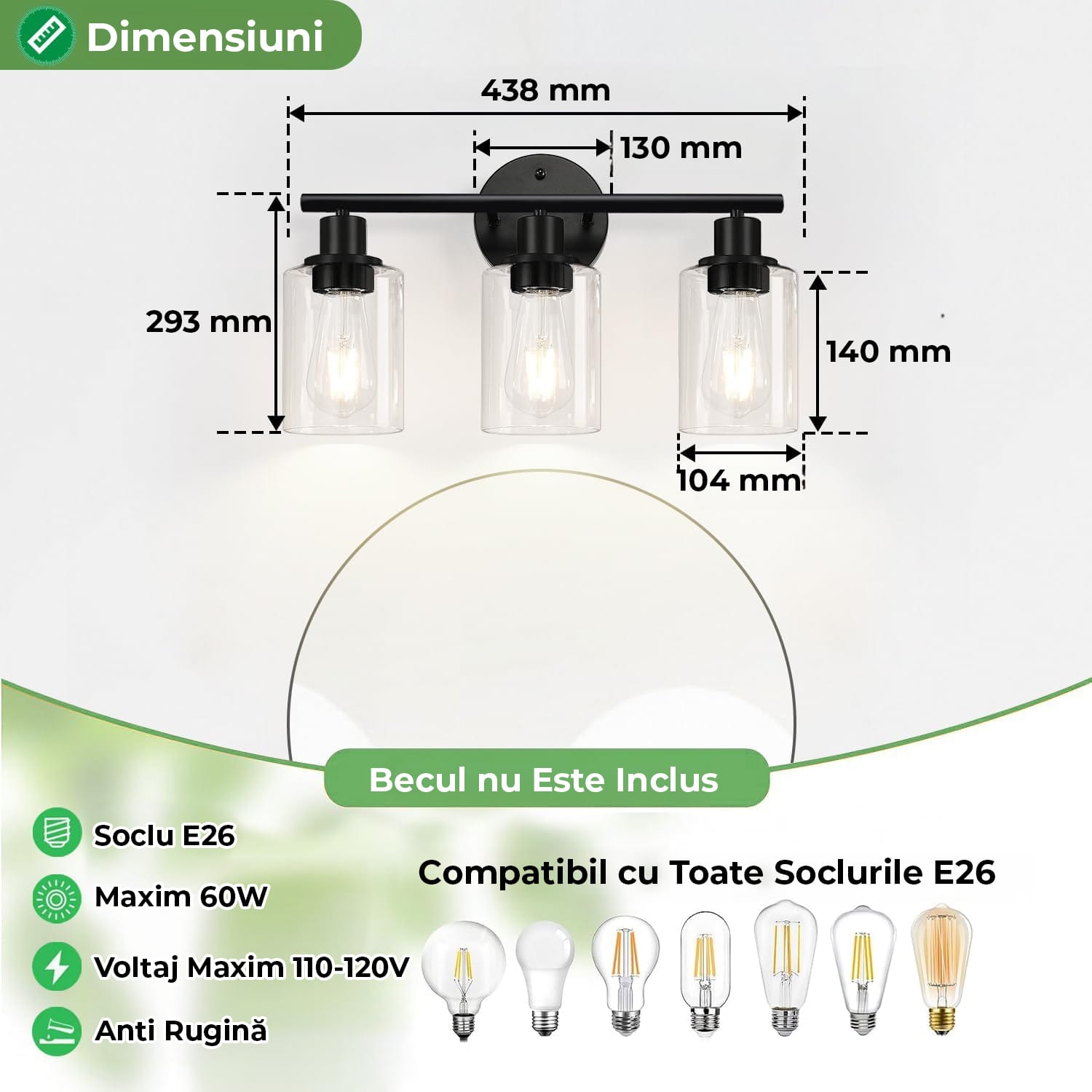 Finisaj negru mat: Corpurile de iluminat pentru oglinda din baie prezintă un corp elegant cu finisaj negru mat, însoțit de abajururi din sticlă transparentă. Finisajul îmbunătățit nu numai că adaugă o notă elegantă, dar include și un strat rezistent la zgârieturi și coroziune, asigurând că lampa neagră pentru baie să își mențină aspectul impecabil în timp. Această lampă de baie vintage este potrivită pentru diverse stiluri de decor, fiind alegerea perfectă pentru a vă îmbunătăți iluminatul casei.