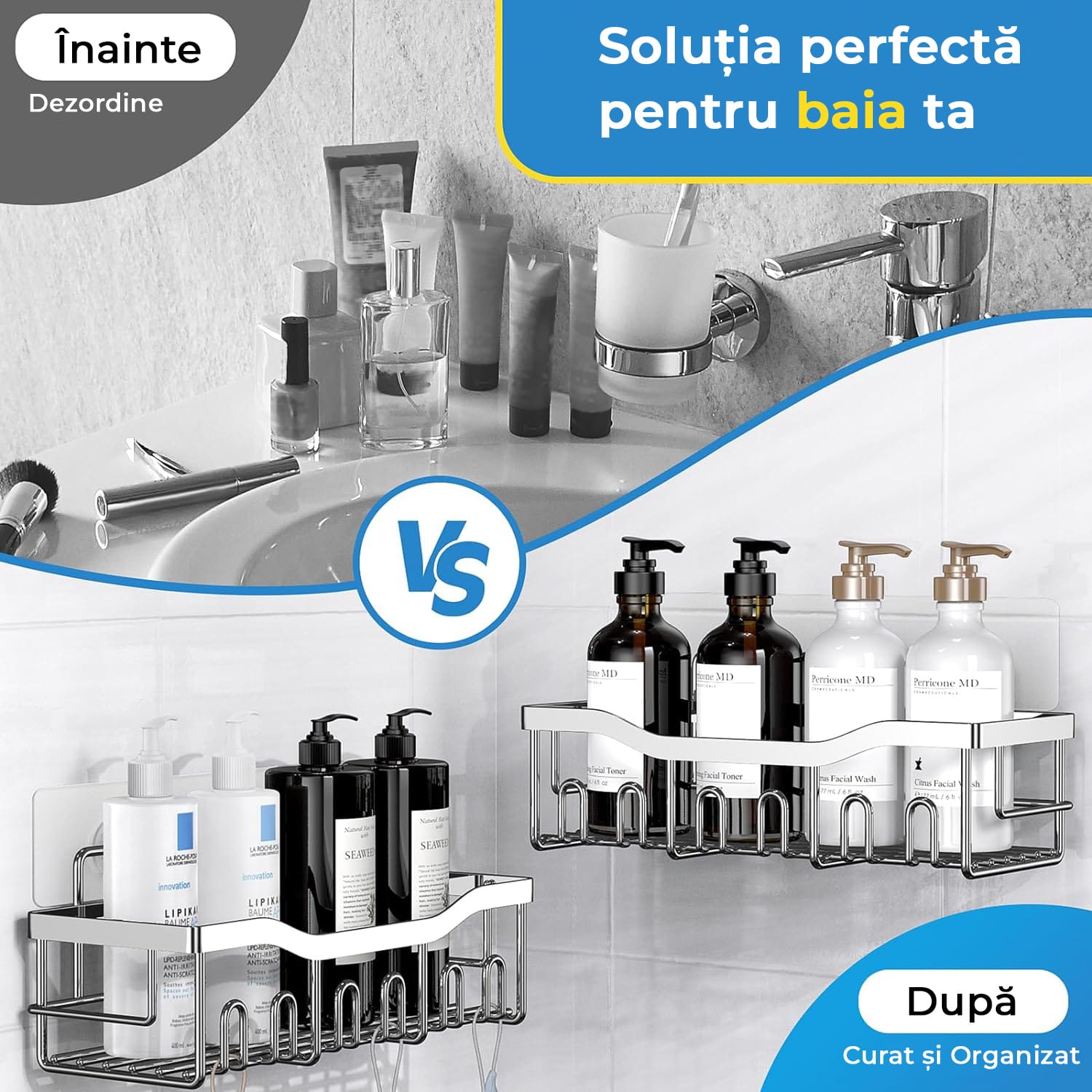 Instalare Usoara: Organizatorul se fixeaza simplu cu adezivi, fara gaurire, fara a necesita unelte, si nu provoaca daune peretilor. Designul elegant va ofera o experienta confortabila.