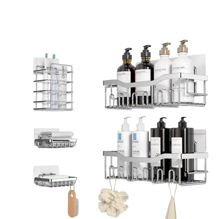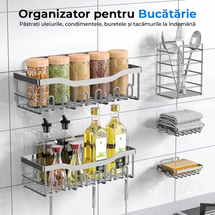 Organizator pentru Baie/Bucatarie cu 5 Piese: Setul de rafturi include 2 suporturi pentru dus, 2 suporturi pentru sapun, 1 suport pentru periuta de dinti si 5 adezivi. Organizatorul are o capacitate mare de stocare,poate adaposti toate produsele dvs. De asemenea, este potrivit pentru baie, bucatarie, debara si altele. Acoperind o multitudine de roluri pentru a satisface nevoile dvs.