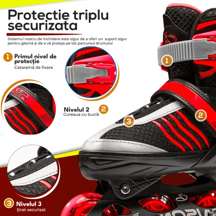 Siguranta si confortul copiilor sunt prioritatea noastra. Rolele noastre in linie reglabile sunt dotate cu un sistem de protectie tripla, inclusiv catarame cu parghie Cam, curea si sireturi. Cadrul din aliaj de aluminiu ofera suport sigur pentru glezna, iar cizma interioara este respirabila.