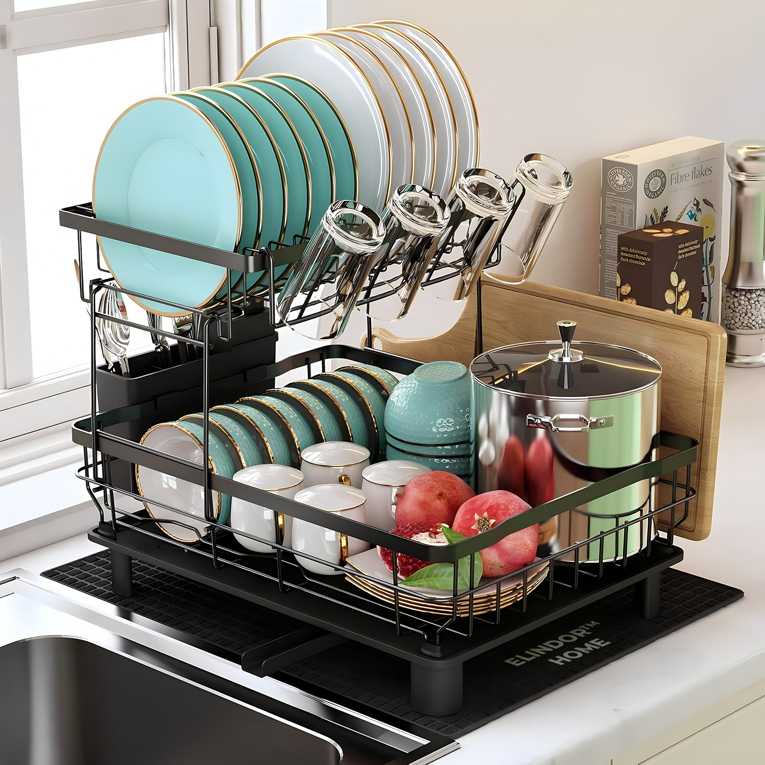 Suportul de vase Elindor este soluția completă pentru uscarea igienică a veselei în bucătării mici. Construit din materiale rezistente la coroziune, cu scurgere direcționată și suport pentru tacâmuri cu protecție pentru cuțite, acest model combină funcționalitatea cu designul modern.