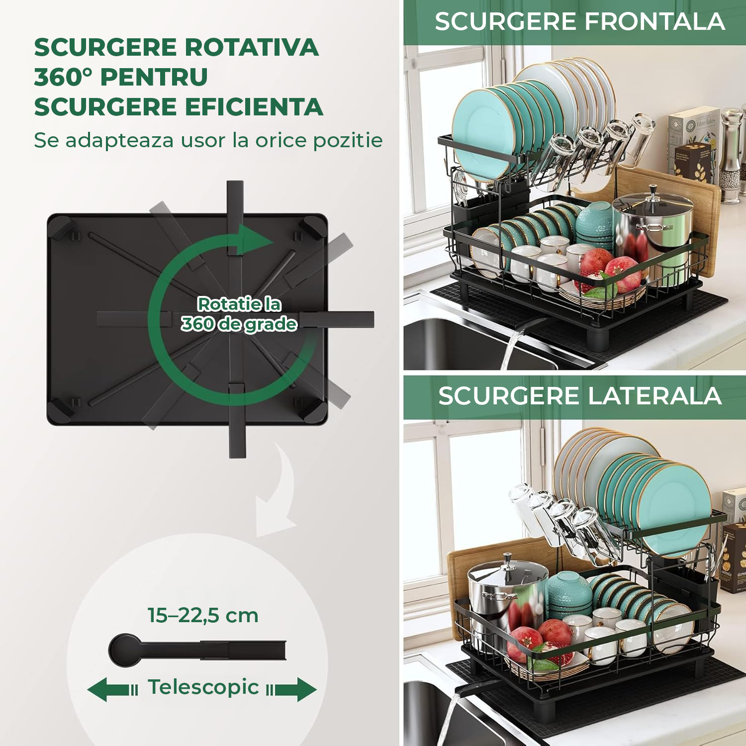 Tava de scurgere cu pantă accentuată și canale adânci – evacuează eficient apa, menține blatul uscat