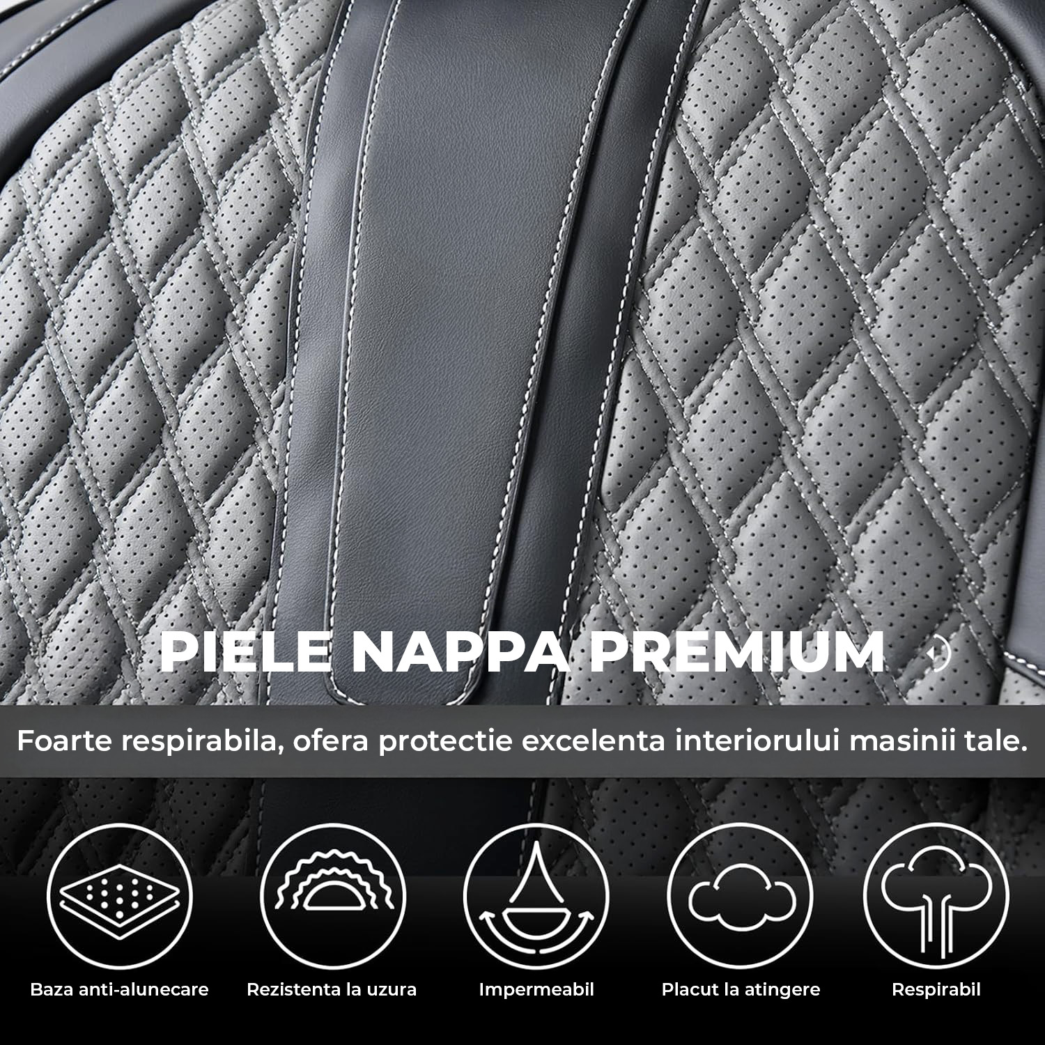 Husele sunt fabricate din piele Nappa de inalta calitate, moale la atingere si placuta la utilizare. Materialul este durabil, impermeabil si rezistent la zgarieturi, oferind in acelasi timp o elasticitate excelenta pentru confort sporit in timpul condusului. Protejeaza eficient tapiteria originala impotriva uzurii si petelor.