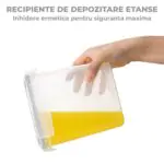 Capace Etanse pentru a Pastra Alimentele Proaspete — Fiecare recipient este prevazut cu un capac care se blocheaza lateral si cu o garnitura din silicon pentru o inchidere perfecta. Sistemul de etansare pastreaza alimentele uscate si proaspete mai mult timp, iar capacele universale fac recipientele usor de curatat si reutilizat de cate ori ai nevoie.
