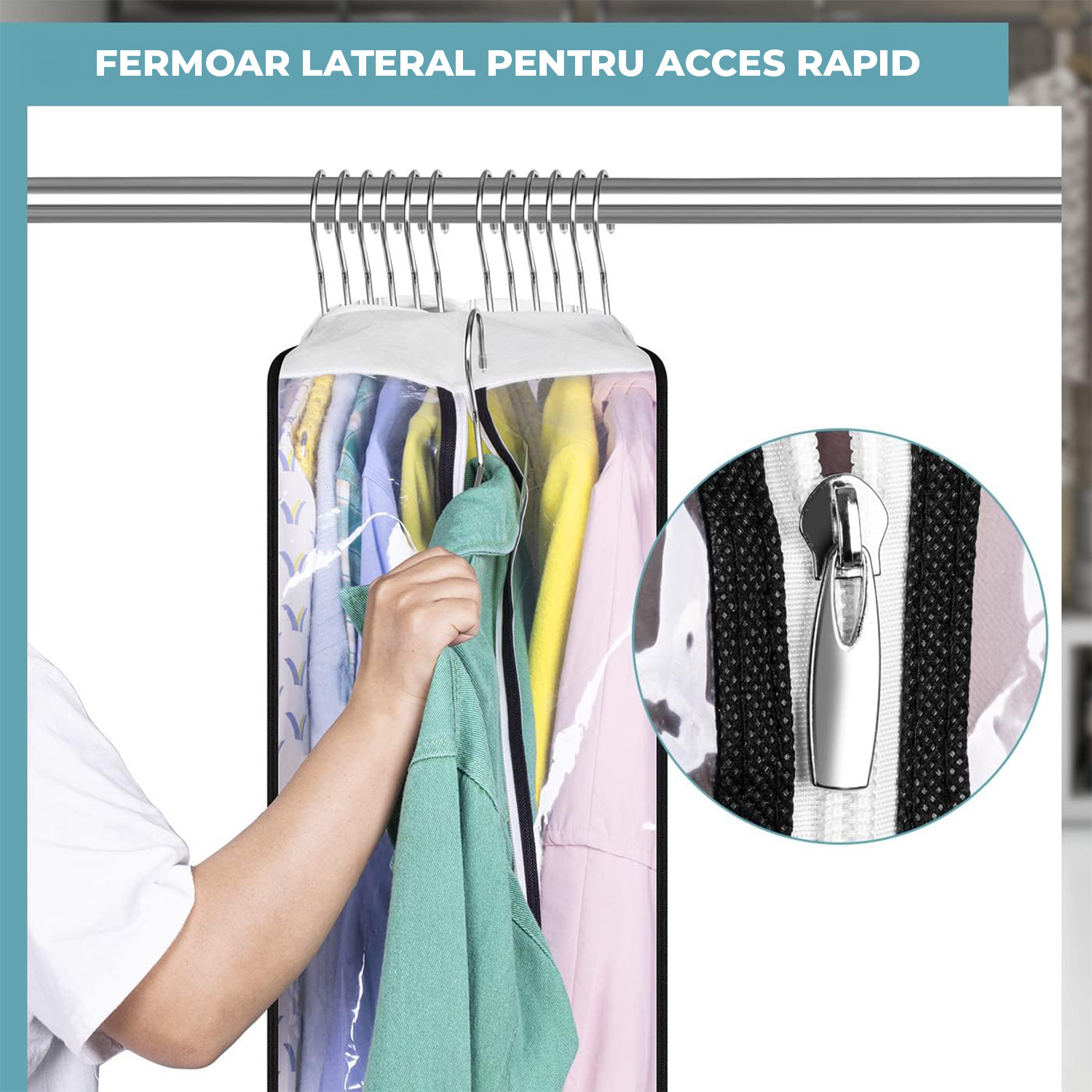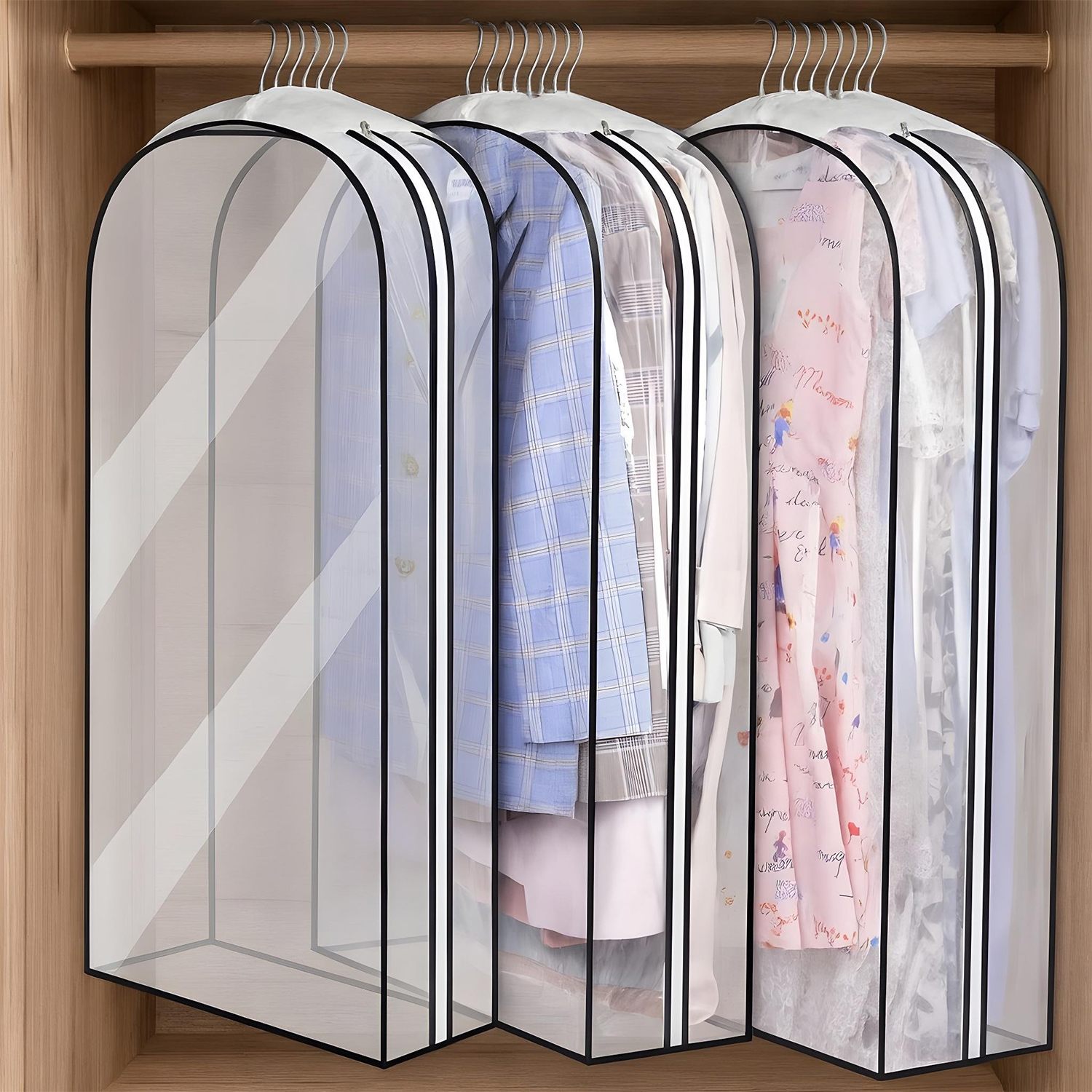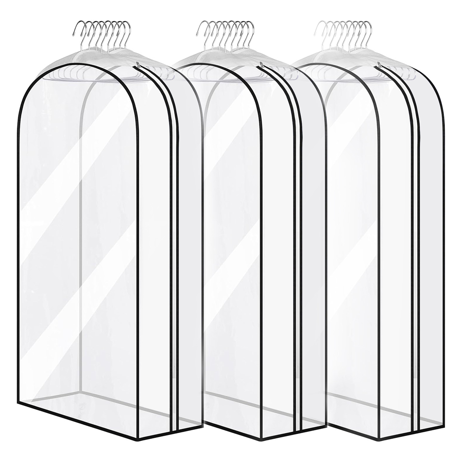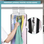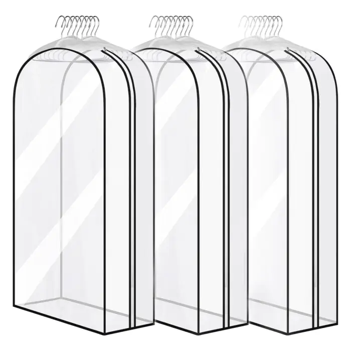 Set 3 huse transparente PEVA impermeabile, 100 x 60 x 25 cm, ideale pentru 10 costume sau 8 paltoane. Cu fermoar lateral metalic, orificiu pentru umerașe și material respirabil, protejează hainele de praf și umezeală, menținându-le curate și organizate.