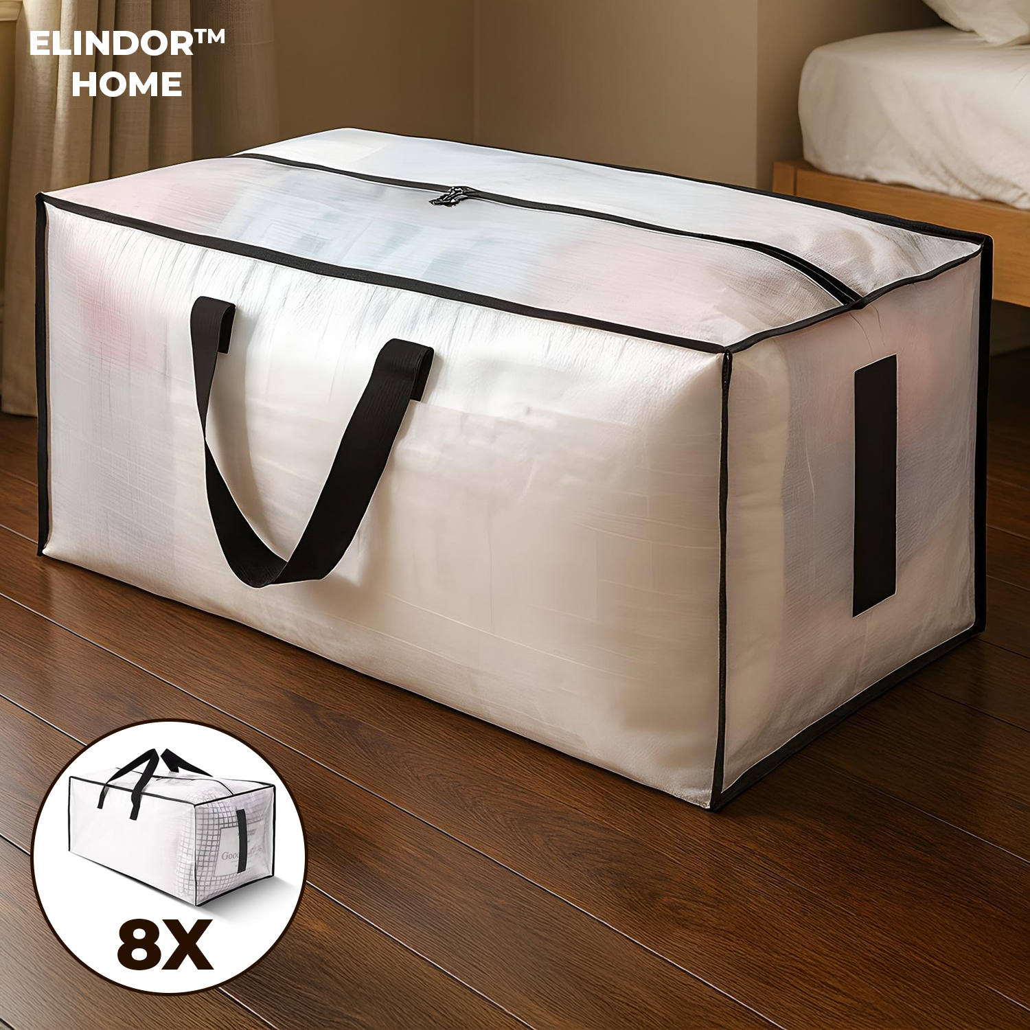 Set 8 Genti Mari de Depozitare Elindor® – Cu Fermoar si Manere, Pliabile, Rezistente la Apa, 86 L, Polipropilena (PP), Semi-Transparent