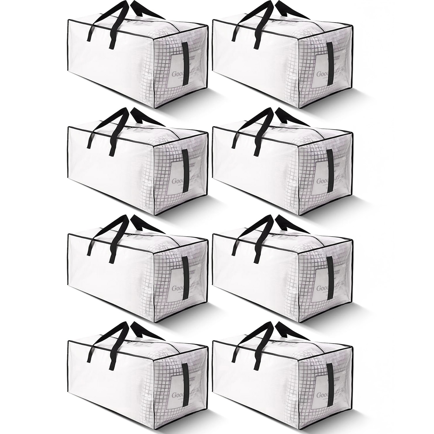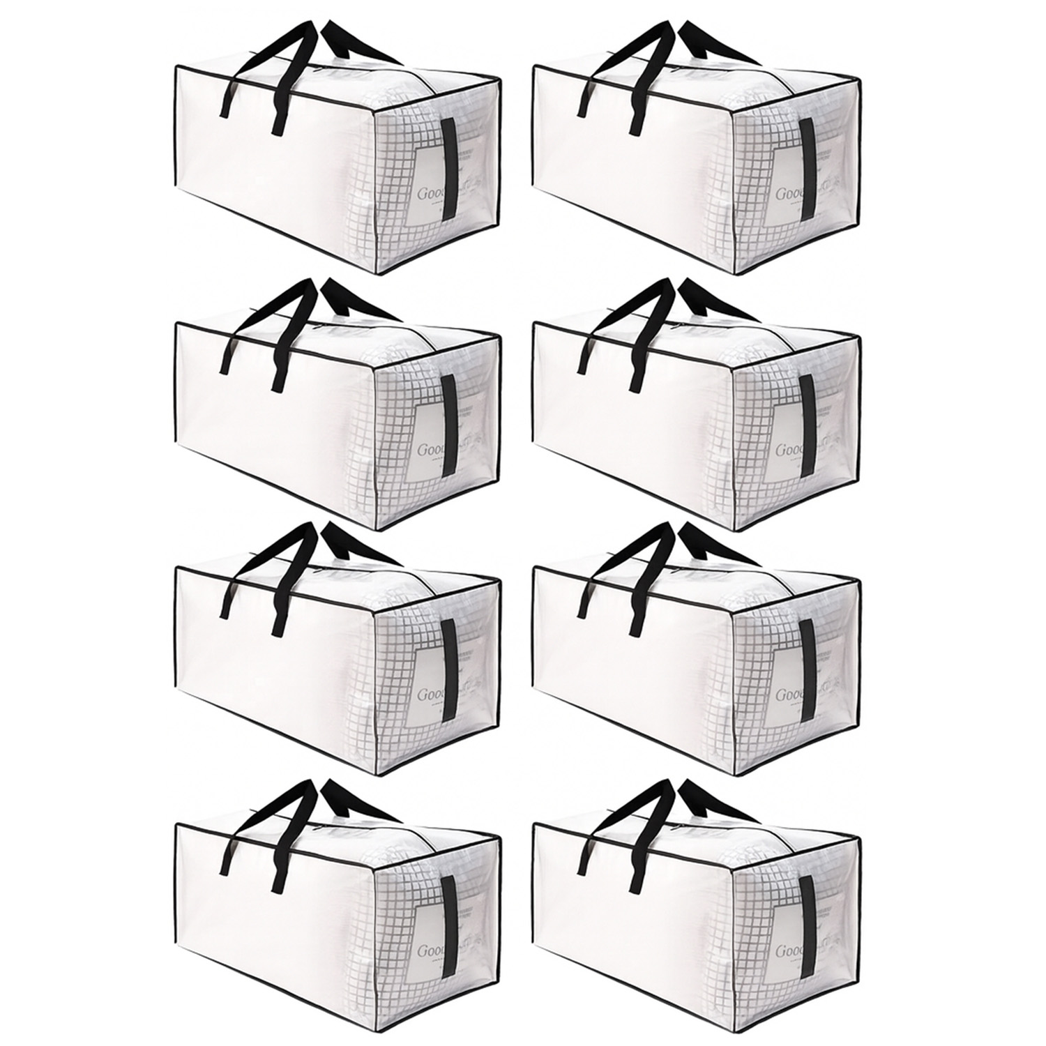 Set 8 genti mari de depozitare Elindor®, realizate din polipropilena rezistenta 180 GSM, cu fermoar ranforsat si manere late. Pliabile, impermeabile si incapatoare (86 L fiecare), ideale pentru haine, lenjerii, jucarii sau mutari. Design semi-transparent pentru identificarea rapida a continutului.