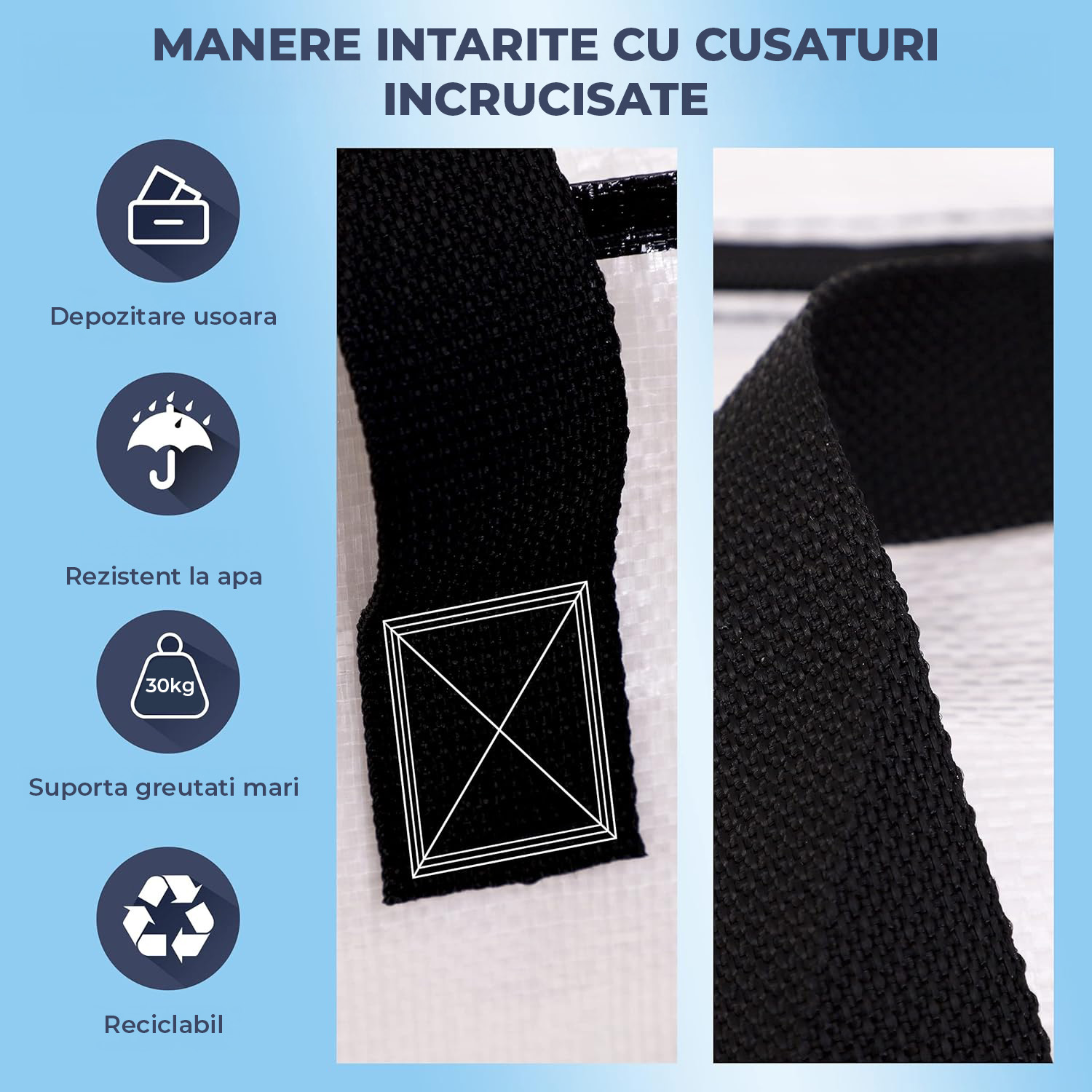 Fiecare geanta este prevazuta cu manere late, tesute, care distribuie greutatea uniform si reduc presiunea asupra mainilor. Sistemul de prindere este ranforsat, oferind siguranta chiar si la transportul incarcaturilor grele.