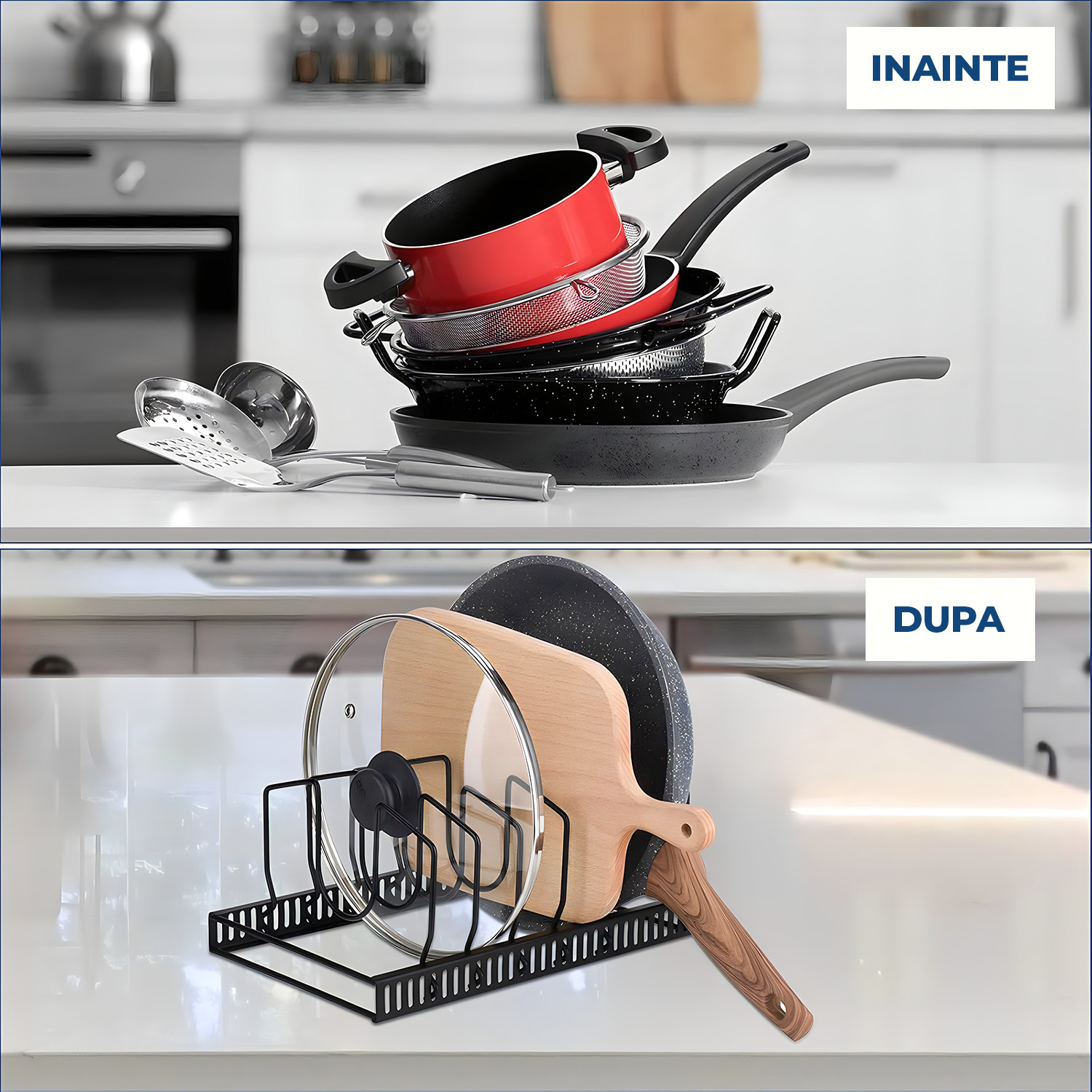 Organizator reglabil din metal rezistent, ideal pentru capace, tăvi, tigăi și vase de gătit. Cu 7 divizoare ajustabile, economisește spațiu în dulapuri sau sub chiuvetă. Ușor de montat, fără unelte. Perfect pentru bucătării mici sau aglomerate. Practic, durabil și eficient.